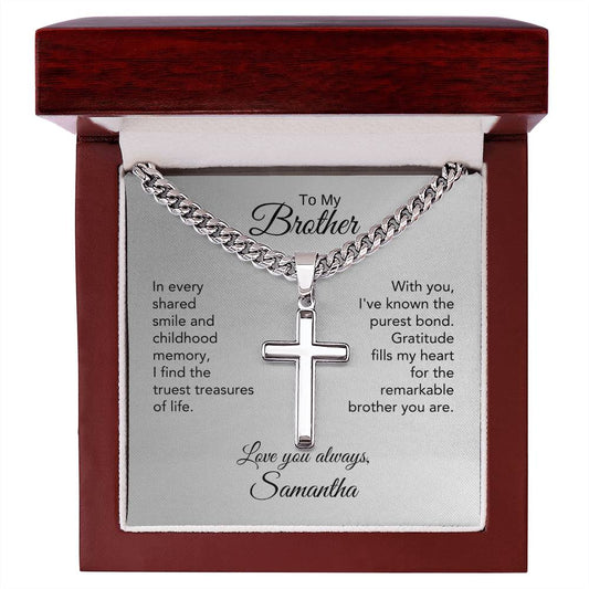 Gift for Brother Cuban Link Chain & Artisan Cross Necklace, Thoughtful Message Included